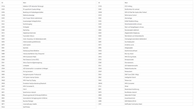 Sonderausstattung: Ausstattungs-Paket: Chili, Ausstattungs-Paket: Wired, Außen-/Innenspiegel mit Abblendautomatik, Außenspiegel-Paket, Business-Paket, DAB-Tuner (Radioempfang digital), Dach schwarz lackiert, Dachreling schwarz, Dekor-/Zierstreifen auf Motorhaube, Fahrassistenz-System: Park-Assistent, Fzg. ohne Modell-Schriftzug, Gepäckraum-Abtrennung (Netz), Head-up-Display, HiFi-Lautsprechersystem Harman-Kardon, LM-Felgen 8x18 (Star Spoke), MINI Connected (Schnittstelle), Panoramadach (Glas) elektrisch, Park-Distance-Control (PDC) vorn und hinten, Rücksitz geteilt/klappbar, Sicht-Paket, Sitzheizung vorn, Sport Sitze vorne, Sonnenschutzverglasung, John Cooper Works Lederlenkrad, Aussenspiegel Anklappfunktion, Komfortzugang, moonwalk-grey metallic, Alarmanlage, Stoff/Leder Cord/carbon black, Weitere Ausstattung: