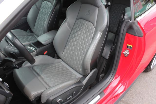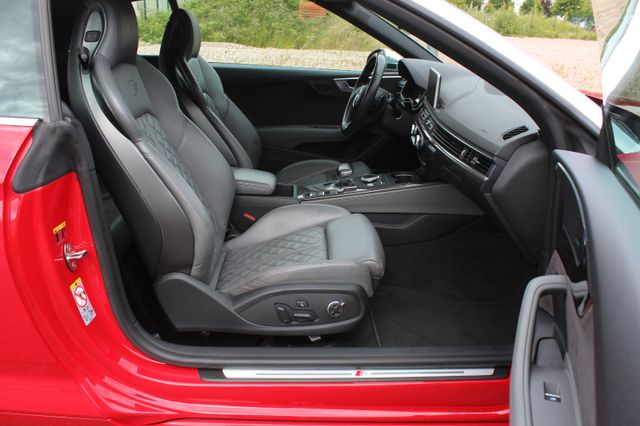 Sonderausstattung: Ablage- und Gepäckraum-Paket, Ambiente-Beleuchtung (Multicolor-LED), Assistenz-Paket Tour, Audi connect (Notruf- und Assistance-System), Außenspiegel elektr. verstell-, heiz- und anklappbar, mit Memory, Bremssättel Rot lackiert, Einparkhilfe vorn und hinten, optisch (APS Plus), Fahrassistenz-System: Spurwechselassistent (Side Assist) inkl. Audi pre sense rear, Fahrassistenz-System: Verkehrszeichenerkennung, Fahrwerk mit Dämpferregelung (Magnetic Ride), Fondsitzanlage mit Ablageschale (2 Sitzplätze), Head-up-Display, Innenausstattung: Dekoreinlagen Carbon, Innenausstattung: Interieurelemente in Kunstleder, Innenspiegel mit Abblendautomatik, Komfort-Klimaautomatik 3-Zonen, Lenkrad heizbar (Leder - 3-Speichen) mit Multifunktion plus, LM-Felgen 9x20 (5-Arm, Rotor-Design, Titanoptik matt, glanzgedreht), Matrix-LED-Scheinwerfer, Metallic-Lackierung, Multi-Media-Interface MMI Navigation Plus mit MMI Touch, Rückfahrkamera, S Sportsitze vorn, Sitze vorn elektr. verstellbar (links mit Memory), Sound-System Bang & Olufsen, Sportdifferential, Wagenheber Weitere Ausstattung: Abbiege- und Allwetterlicht, Airbag Beifahrerseite abschaltbar, Airbag Fahrer-/Beifahrerseite, Akustik-Verdeck, Audi Drive Select, Automatische Fahrlichtschaltung (ALS), AUX-IN-Anschluss, Außenspiegel Aluminium-Optik matt, Außenspiegel asphärisch, links, Außenspiegel asphärisch, rechts, Außenspiegel konvex, links, Außenspiegel konvex, rechts, Blinkleuchten LED in Außenspiegel integriert, Diebstahlsicherung für Räder (Felgenschlösser), Einstiegsleisten mit Aluminiumeinlage und Schriftzug, beleuchtet, Fahrassistenz-System: City-Notbremsfunktion (Audi pre sense City), Fahrer-Informations-System (FIS) mit Farbdisplay, Frontscheibe Akustikglas, Fußmatten Velours, Geschwindigkeits-Begrenzeranlage, Glanz-Paket, Heckklappenöffnung automatisch, Heckleuchten LED mit dynamischem Blinklicht, Heckscheibe heizbar, Isofix-Aufnahmen für Kindersitz, Karosserie: 2-türig, Licht-Paket, Make-up-Spiegel beleuchtet, Motor 3,0 Ltr. - 260 kW V6 24V TFSI, Multi-Media-Interface MMI Basic Plus / MMI Radio Plus, Nichtraucher-Paket, Parkbremse elektro-mechanisch, Pedale und Fußstütze in Edelstahl, Reifen-Reparaturkit, Reifendruck-Kontrollsystem, Rücksitzlehne geteilt/klappbar, Schadstoffarm nach Abgasnorm Euro 6, Scheibenwaschdüsen heizbar, Seitenairbag vorn, Sitzbezug / Polsterung: Alcantara Frequenz / Leder, Sitze vorn mit ausziehbarer Oberschenkelauflage, Sitzheizung vorn, Start/Stop-Anlage, Stoßfänger Sport-Design mit Diffusoreinsatz hinten, Universal-Schnittstelle Bluetooth, Windschott, Wärmeschutzverglasung grün getönt, Zentralverriegelung / Startanlage Keyless-Go
